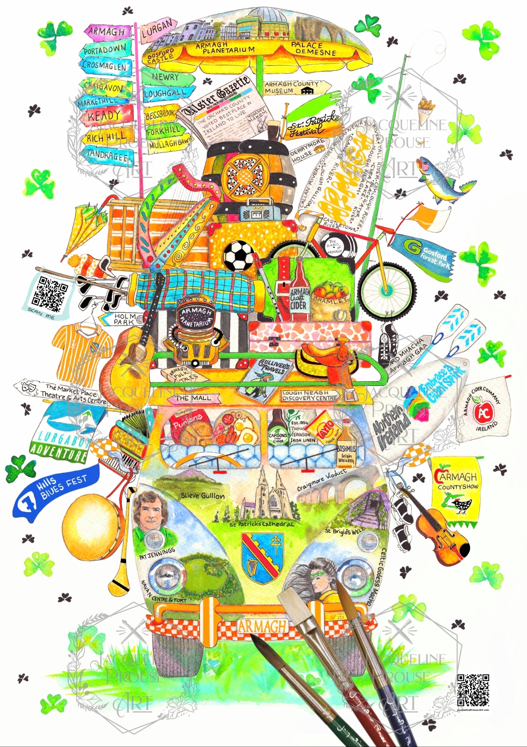 Each Rare Irish Wagon includes two discreet QR codes, one linking to that county’s official tourism page, and one to my website, simply scan them to explore stories, landmarks, and the world behind the artwork