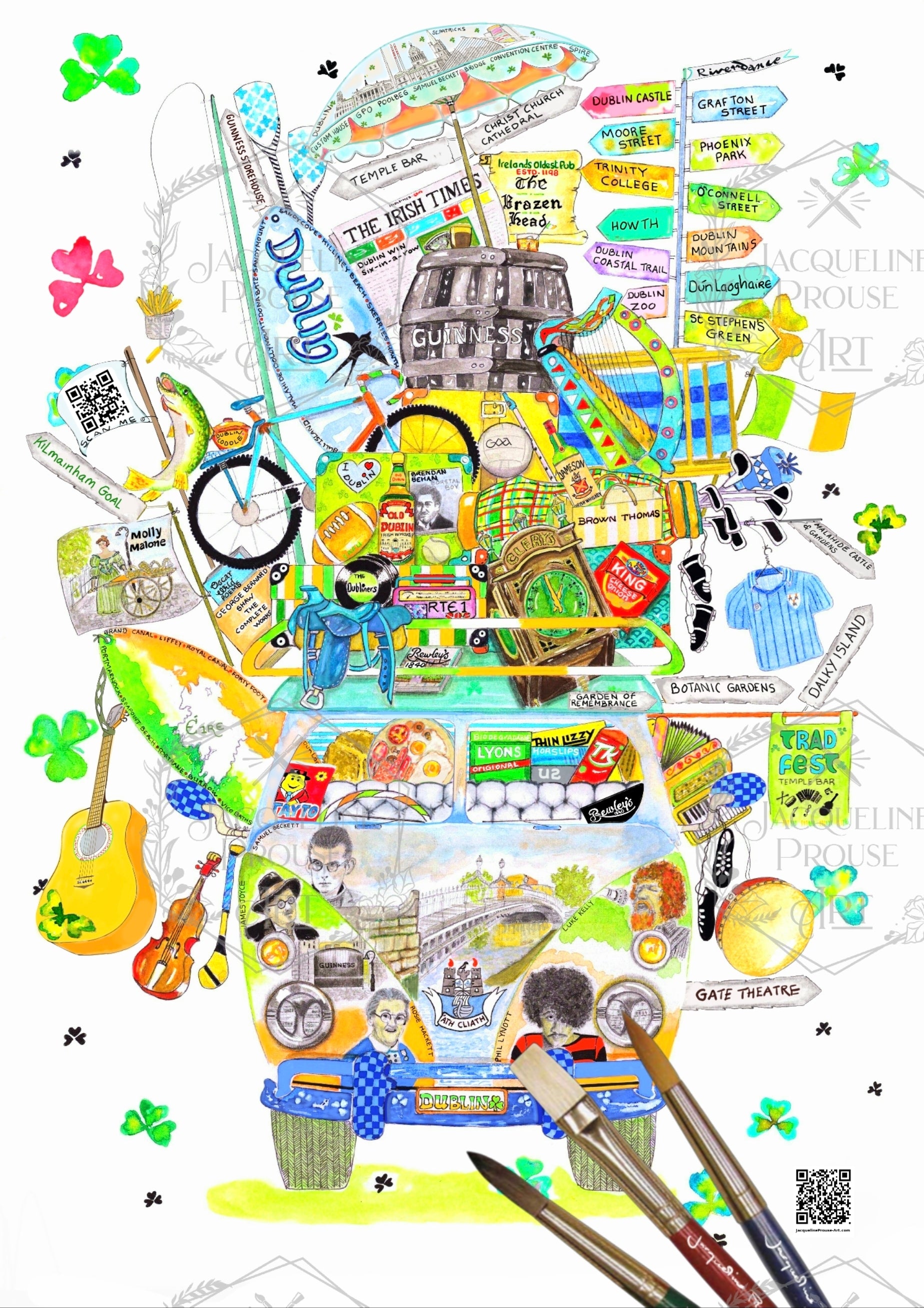 Each Rare Irish Wagon includes two discreet QR codes, one linking to that county’s official tourism page, and one to my website, simply scan them to explore stories, landmarks, and the world behind the artwork.