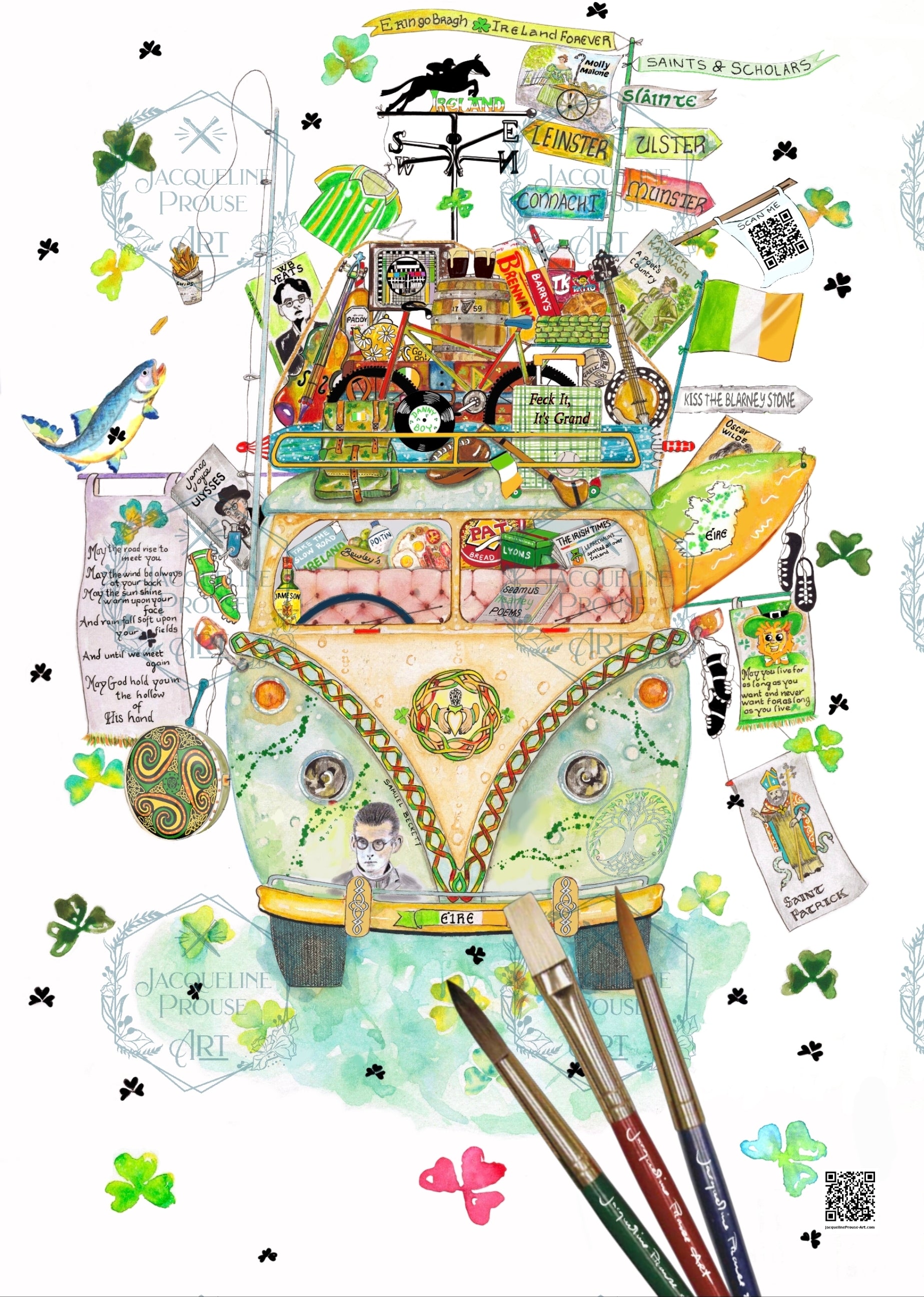 Each Rare Irish Wagon includes two discreet QR codes, one linking to that county’s official tourism page, and one to my website, simply scan them to explore stories, landmarks, and the world behind the artwork.