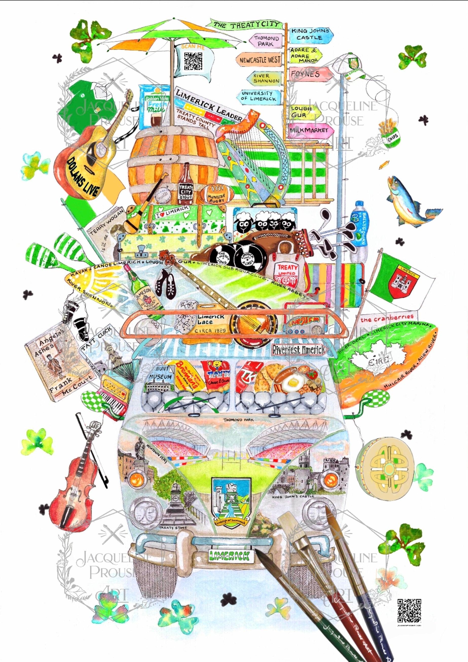 Each Rare Irish Wagon includes two discreet QR codes, one linking to that county’s official tourism page, and one to my website, simply scan them to explore stories, landmarks, and the world behind the artwork