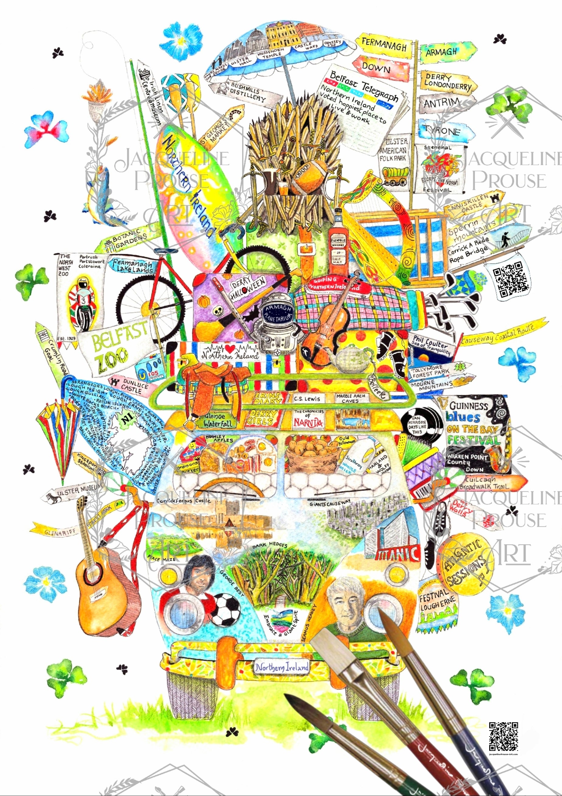 Each Rare Irish Wagon includes two discreet QR codes, one linking to that county’s official tourism page, and one to my website, simply scan them to explore stories, landmarks, and the world behind the artwork.
