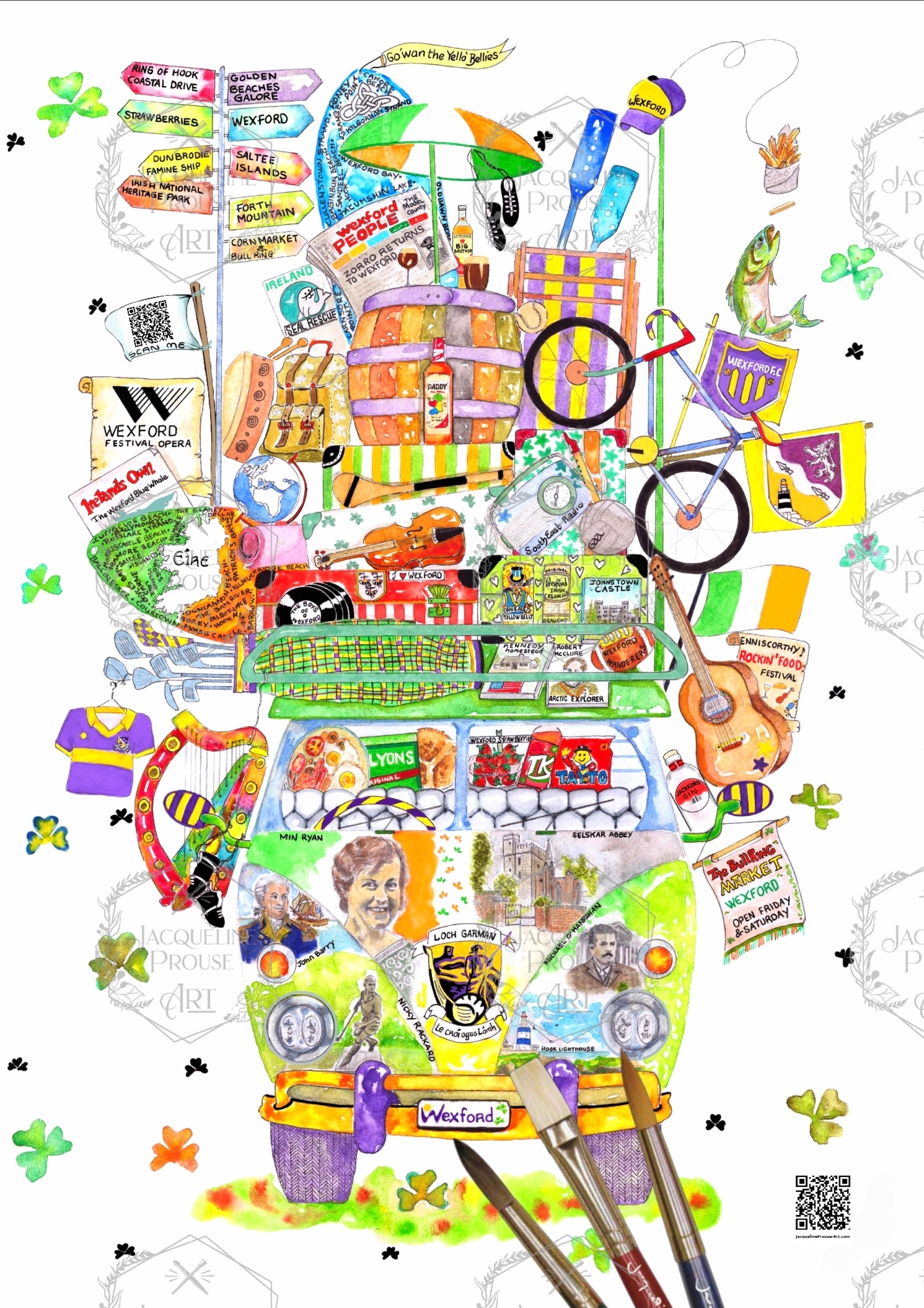 Each Rare Irish Wagon includes two discreet QR codes, one linking to that county’s official tourism page, and one to my website, simply scan them to explore stories, landmarks, and the world behind the artwork.