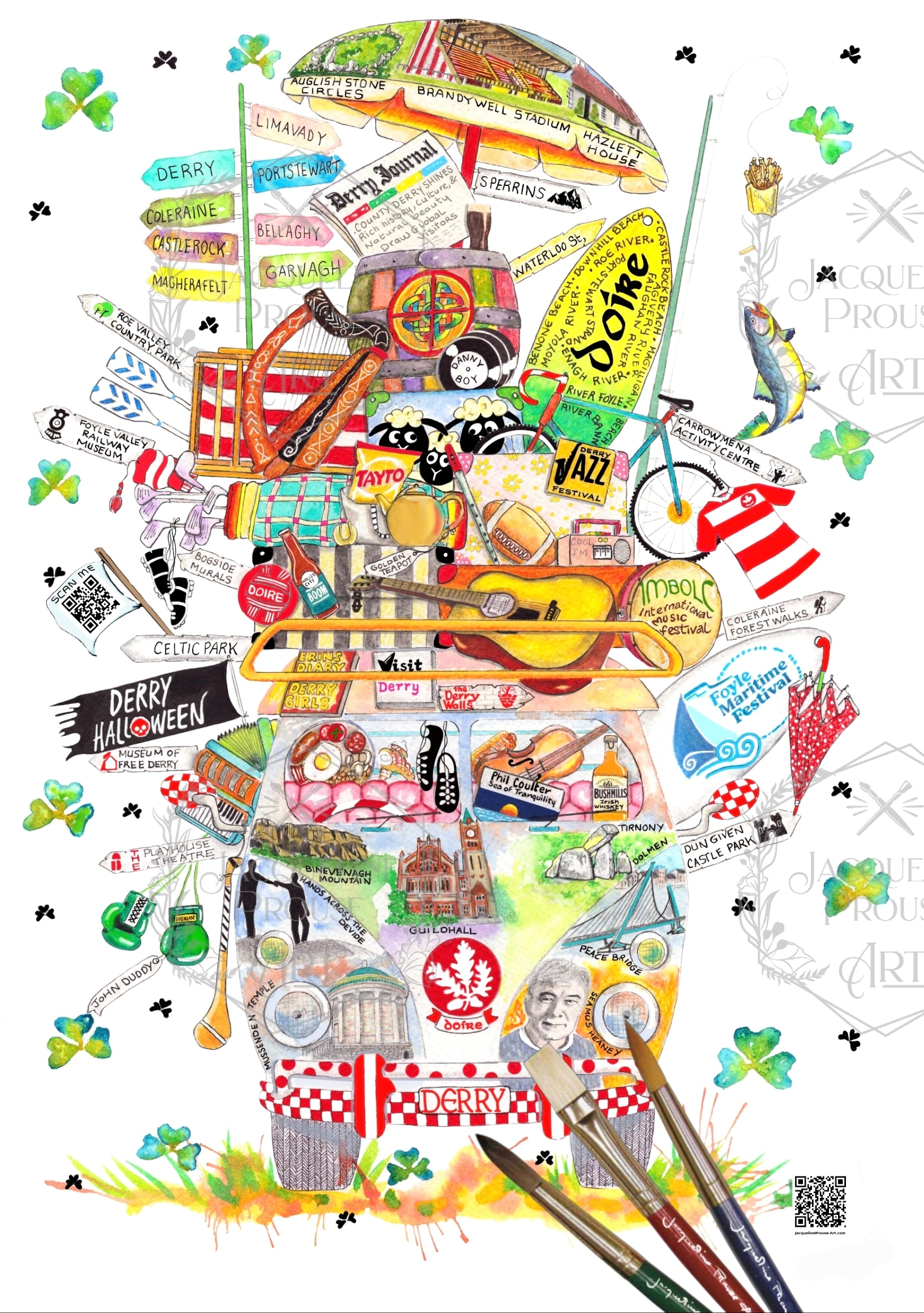 Each Rare Irish Wagon includes two discreet QR codes, one linking to that county’s official tourism page, and one to my website, simply scan them to explore stories, landmarks, and the world behind the artwork